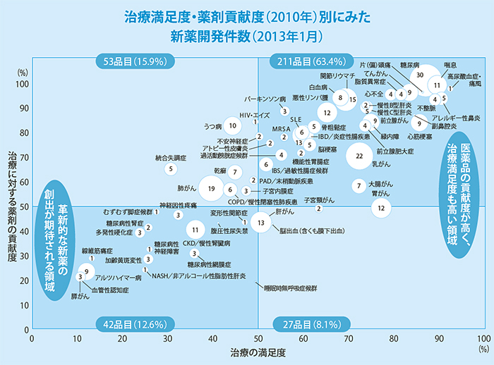Comparing 2005 and 2010 data on treatment satisfaction, the launch of new drugs has improved treatment satisfaction and the contribution of drugs to treatment in many areas, such as rheumatoid arthritis, osteoporosis, and cerebral infarction. However, 12.6% (42 drugs) of the new drugs in development or to be approved are still in areas where both the contribution of the drug to the treatment of the disease and physician satisfaction with the treatment are low (lower left quadrant).