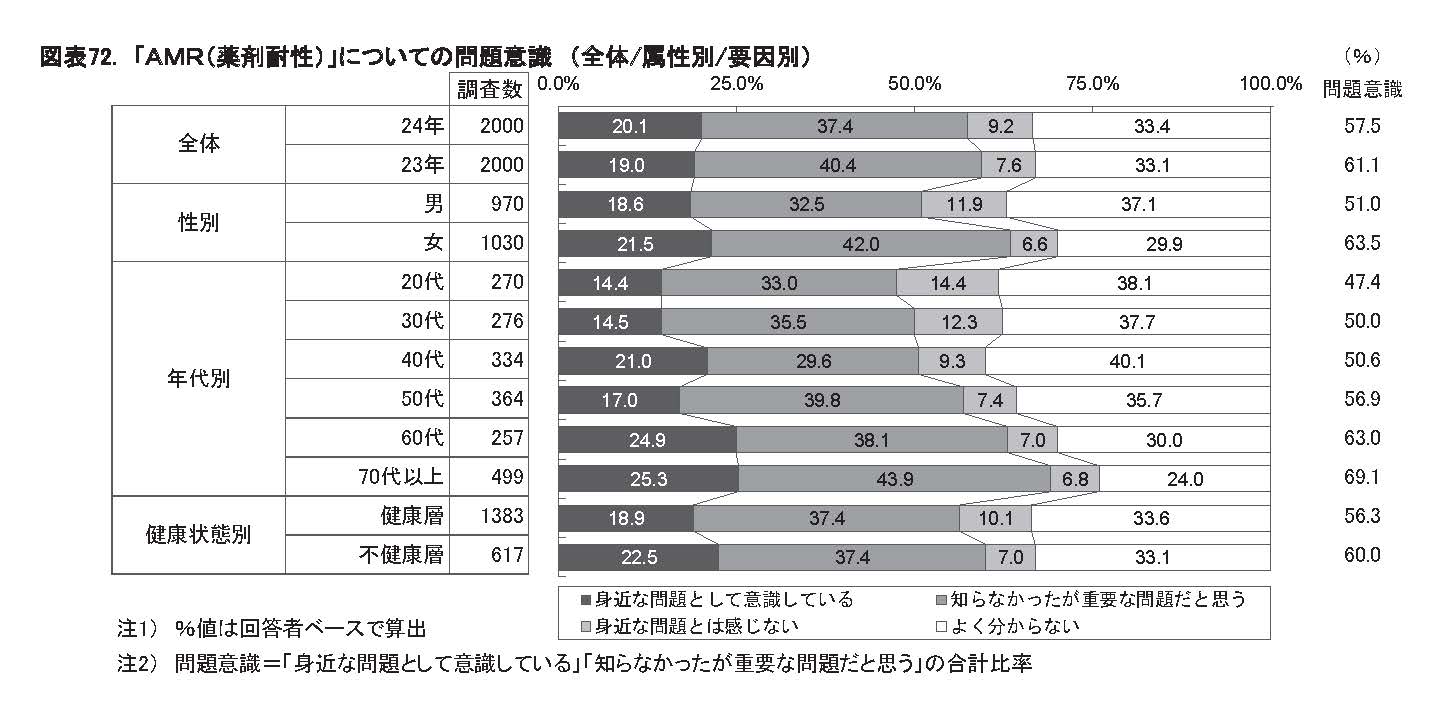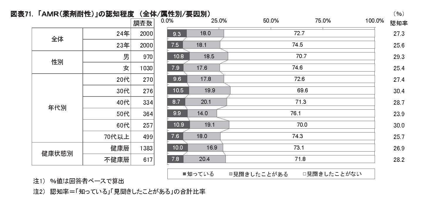 The results of the 18th survey conducted in 2024 show that 9.3% of respondents were aware of AMR, 18.0% had seen or heard of it, and 72.7% had never seen or heard of it. The proportion of respondents who were "not aware of it but think it is an important issue" was 37.4%, while 9.2% said they "do not feel it is an issue close to home" and 33.4% said they "do not know much about it.